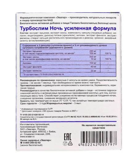 Биокомплекс ночного действия, способствует интенсивному снижению лишнего веса во время ночного отдыха. Эта биологически активная добавка (БАД) содержит L-карнитин, Хром и экстракт Гарцинии, ускоряющие сжигание жиров; экстракты Сенны, предотвращающей скопление газов и колики; экстракт Мелиссы, улучшающий сон; Линолевую кислоту, подавляющую механизм образования подкожного жира; витамины группы В и Е, цинк, улучшающие обмен веществ. Таким образом, комплекс стимулирует выведение шлаков и токсинов, улучшает утренние процессы очищения, снижает отеки и способствует лучшему отдыху во время сна.