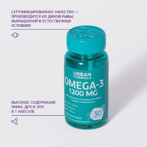 Omega-3 (Омега-3) от Urban Formula — источник полезных жирных кислот для красоты и молодости кожи, памяти и внимания. Одной упаковки достаточно для полноценного курса. В каждой капсуле — высокое содержание ПНЖК, ДГК и ЭПК - натуральные компоненты из дикой рыбы, выращенной в естественных условиях. Прием курса поможет поддержать когнитивные функции нервной системы, предотвратит хроническую усталость, улучшит интеллектуальные способности.