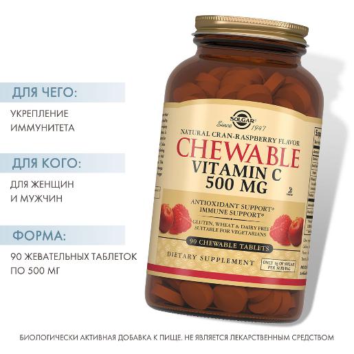 Таблетки Витамин С 500 с Малиновым вкусом разработаны американской компанией Solgar. Является биологически активной добавкой. Назначение -Витамин С укрепляет иммунную систему, уменьшает риск возникновения инфекций или значительно сокращает длительность болезни, увеличивает активность лейкоцитов, имеет мощные антиоксидантные свойства, обеспечивающие защиту от отрицательного влияния свободных радикалов.