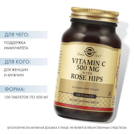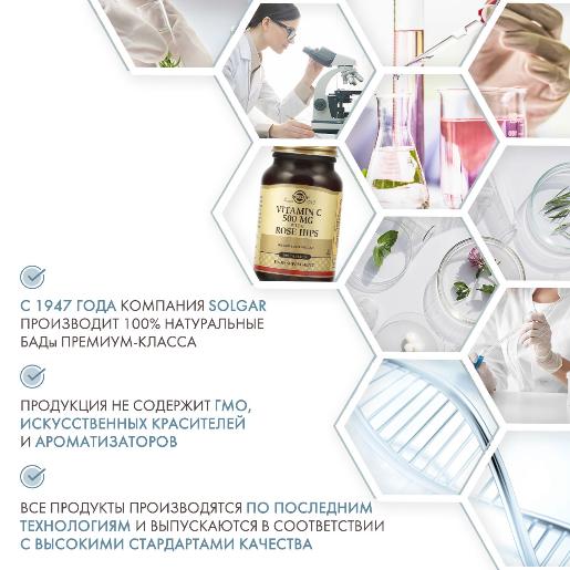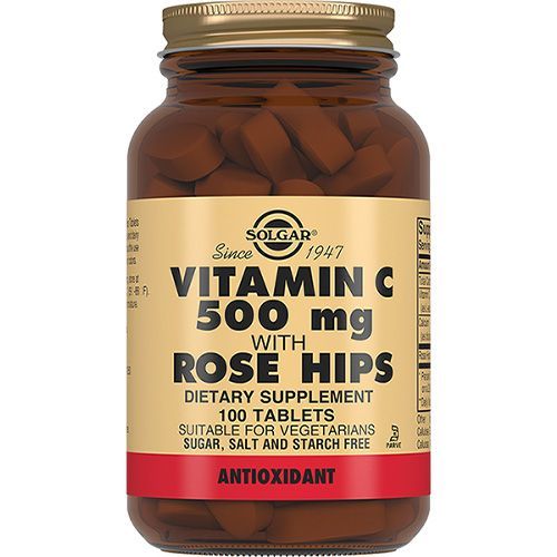 Таблетки Витамин С и шиповник разработаны американской компанией Solgar. Является биологически активной добавкой. Назначение -Витамин С укрепляет иммунную систему, уменьшает риск возникновения инфекций или значительно сокращает длительность болезни, увеличивает активность лейкоцитов, имеет мощные антиоксидантные свойства, обеспечивающие защиту от отрицательного влияния свободных радикалов. Соединение витамина С с биофлавоноидами оказывается полезным даже при аллергиях, потому что это обеспечивает детоксикацию гистамина, вызывающего аллергию. Кроме того, витамин С и биофлавоноиды усиливают действия друг друга.