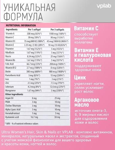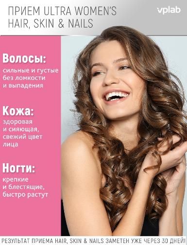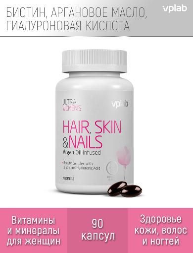Ultra Women’s Hair, Skin & Nails от VPLAB - комплекс витаминов, минералов, натуральных масел и экстрактов, созданный с учетом женской физиологии для здоровья и красоты кожи, ногтей и волос.