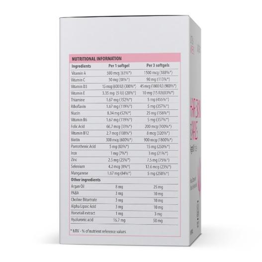 Пищевая ценность (средние значения) в 1 порции - 1 капсула (в % от Рекомендуемого уровня суточного потребления/адекватного уровня потребления): витамин С – 30 мг (50%), витамин РР - 2,34 мг (13%), витамин В6 - 1,67 мг (83,5%), витамин В2 - 1,67 мг (104%), В1 - 1,67 мг (119%), Е - 3,35 мг (33,5%), фолиевая кислота - 66,7 мкг (33%), витамин В12 - 2,7 мкг (270%), биотин - 150 мкг (300%), витамин Д3 - 15 мкг (600МЕ) (300%), пантотеновая кислота – 5 мг (83%), витамин А - 500 мкг (62,6%), липоевая кислота - 3,34 мг (11,1%*), цинк – 2 мг (13,3%), марганец - 1,3 мг (65%*), гиалуроновая кислота - 16,7 мг (33,4%).