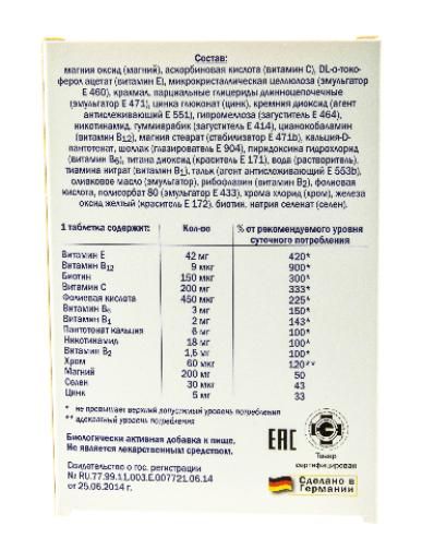 Витамины Е, В12, C, B6, В1 , B2, биотин, фолиевая кислота, пантотенат кальция, никотинамид, хром (III хлорид), селен (селенит), магний (оксид), цинк (глюконат)