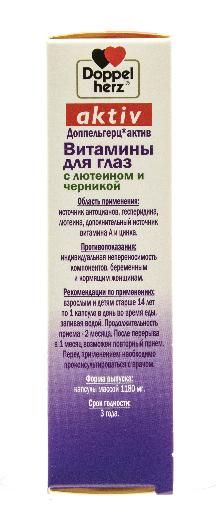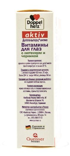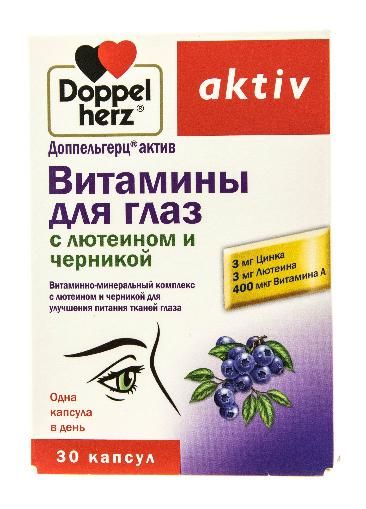 Доппельгерц® актив Витамины для глаз с лютеином и черникой – это витаминно-минеральный комплекс с лютеином и черникой для улучшения питания тканей глаза. Препарат способствует улучшению зрения в условиях сумерек, увеличению полей зрения и уменьшению усталости глаз. Улучшает кровоснабжение сетчатки глаза, способствует ускорению регенерации ткани сетчатки. Черника - ягода, оказывающая благотворное воздействие на сетчатку глаз. Это положительное влияние черники на глаза обусловлено антиоксидантным эффектом, которым обладают флавоноиды, содержащиеся в ее листьях и плодах. Черника также расслабляет стенки сосудов и расширяет кровеносные сосуды, снижает риск тромбообразования.