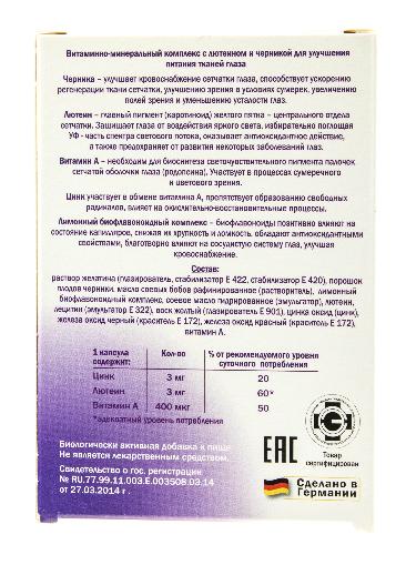 Порошок плодов черники, лимонный биофлавоноидный комплекс, лютеин суспензия, цинк оксид, витамин А