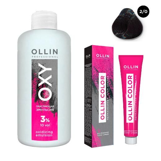 Набор "Перманентная крем-краска для волос Ollin Color оттенок 2/0 черный 100 мл + Окисляющая эмульсия Oxy 3% 150 мл"