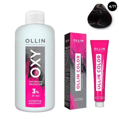Набор "Перманентная крем-краска для волос Ollin Color оттенок 4/71 шатен коричнево-пепельный 100 мл + Окисляющая эмульсия Oxy 3% 150 мл"