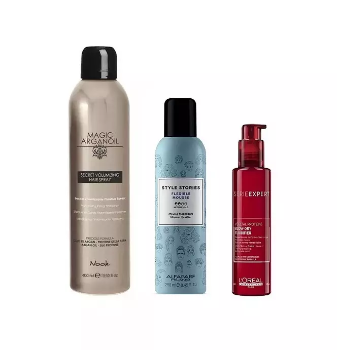 Лак: распылите с расстояния 30 см на влажные волосы для придания формы или на сухие для объема и фиксации прически.