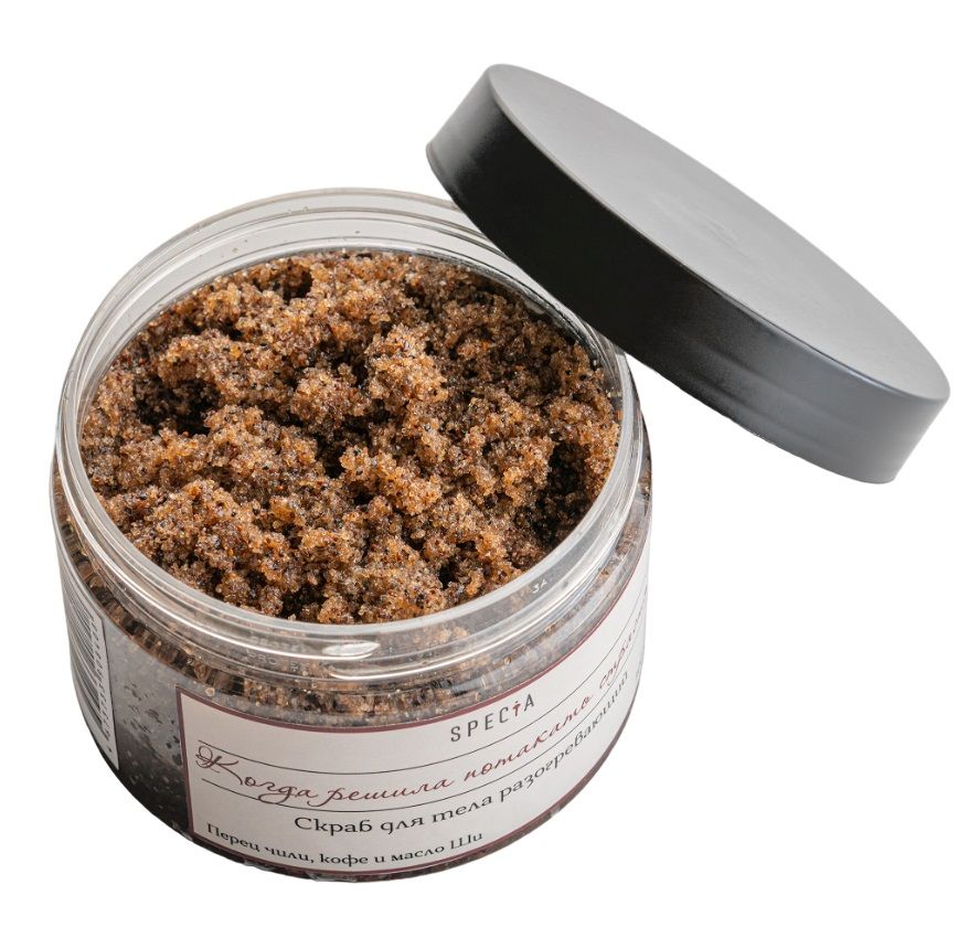 • Скраб разогревающий с перцем чили, кофе и маслом шиморская соль, молотые зерна кофе Арабика, масло ши (карите), масло виноградной косточки, масло зародышей пшеницы, экстракт перца