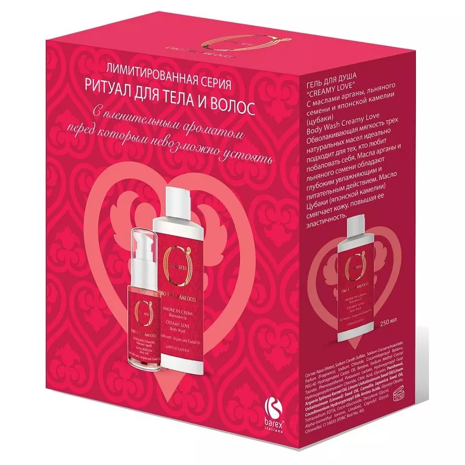 Гель для душа: aqua (water), sodium coceth sulfate, sodium cocoamphoacetate, parfum (fragrance), sodium chloride, cocamidopropyl betaine, peg-40 hydrogenated castor oil, betaine, sodium methyl cocoyl taurate, phenoxyethanol, potassium lactate, hydroxypropyl guar hydroxypropyltrimonium chloride, citric acid, glycerin, panthenol, argania spinosa kernel oil, linum usitatissimum seed oil/linum usitatissimum (linseed) seed oil, camellia japonica seed oil, cocodimonium hydroxypropyl silk amino acids, glyceryl oleate, tetrasodium edta, coco-glucoside, decylene glycol, alpha-isomethyl ionone, linalool, caprylyl glycol, citronellol, ci 16035 (fd&c red no. 40).