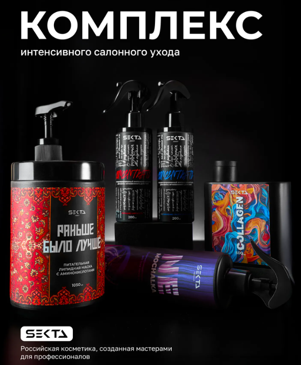 Коллагеновый уход: гидролизованный кератин, гидролизованный коллаген, гидролизованная киноа, масло семян калофиллума, глицерин.