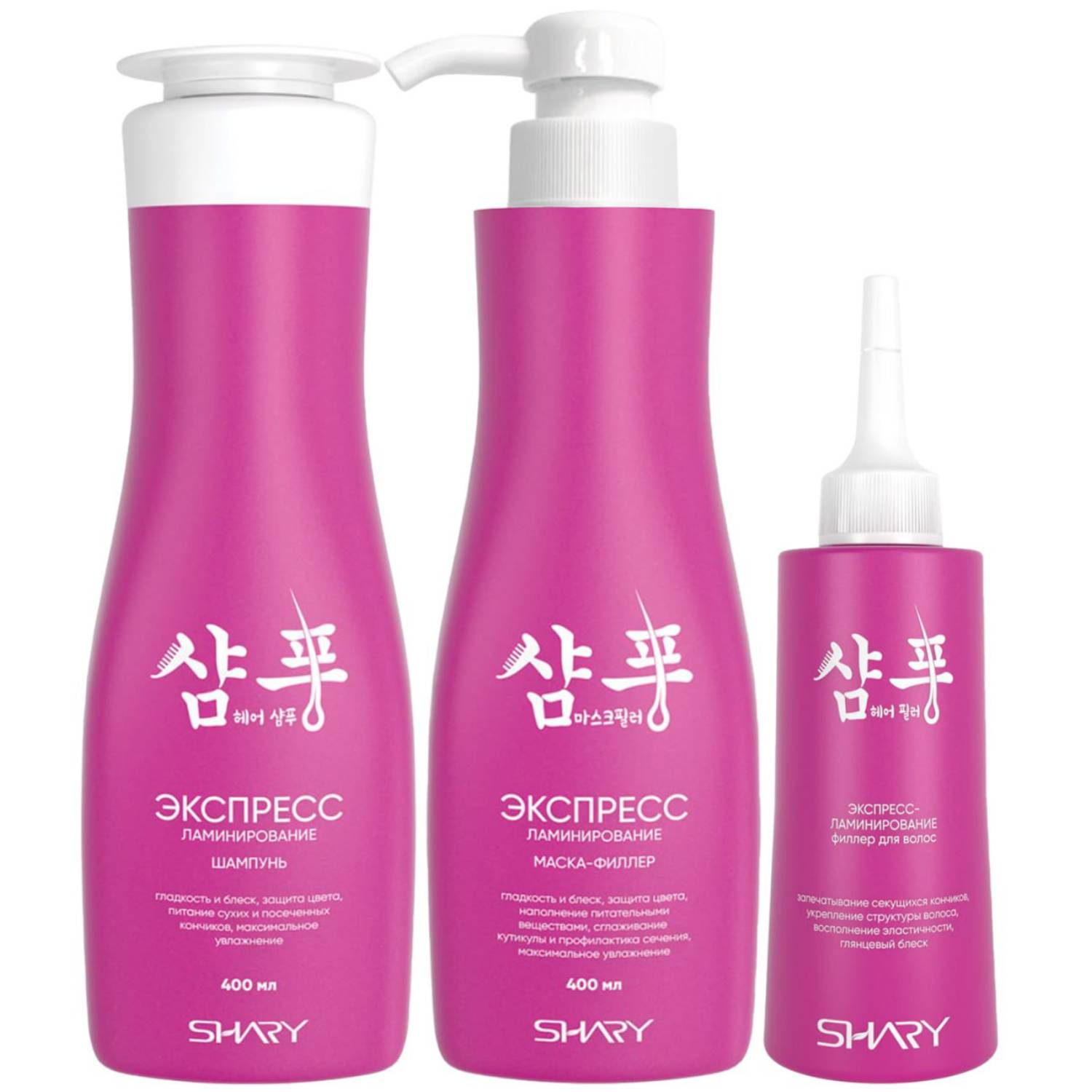 В набор входят три средства для волос, после применения которых волосы становятся гладкими, блестящими и яркими: