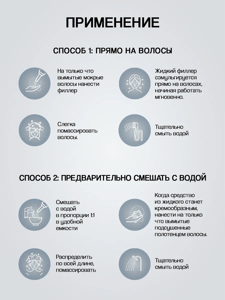 Экспресс-филлер: использовать 1 раз в неделю. Продукт имеет накопительный эффект. способ 1: нанесите филлер на чистые влажные волосы от середины длины до кончиков волос, помассируйте, смойте водой. способ 2: смешайте филлер с водой в соотношении 1:1 в неметаллической емкости до густой консистенции. Распределите на чистых влажных волосах от середины длины до кончиков волос, помассируйте, смойте.