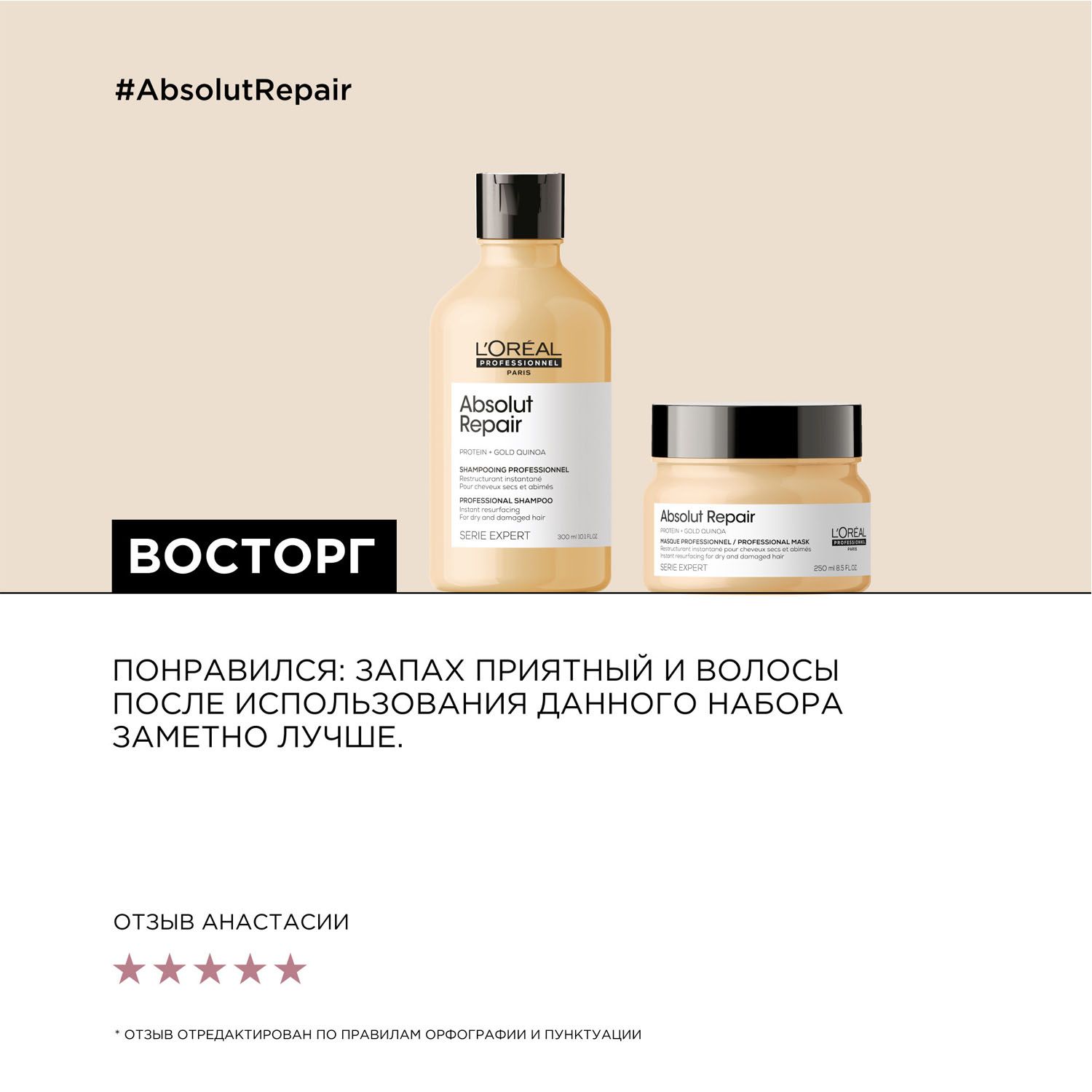 Маска: равномерно нанесите на предварительно вымытые шампунем Absolut Repair и подсушенные полотенцем волосы. Оставьте на 3 – 5 минут. Тщательно смойте. В случае попадания в глаза немедленно промойте их водой.