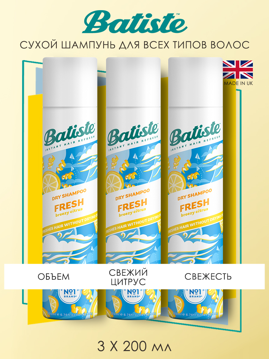 Batiste Fresh - сухой шампунь для волос с ароматом свежести, для быстрого придания чистоты, объема и структурности. Его действие аналогично обычному шампуню, а воздушный и бодрящий аромат дарит ощущение свободы и ветра в волосах. Спрей подойдет для всех типов волос – натуральных, окрашенных, коротких или длинных, седых, осветленных, сухих, жирных, тонких или вьющихся, поврежденных и ослабленных.