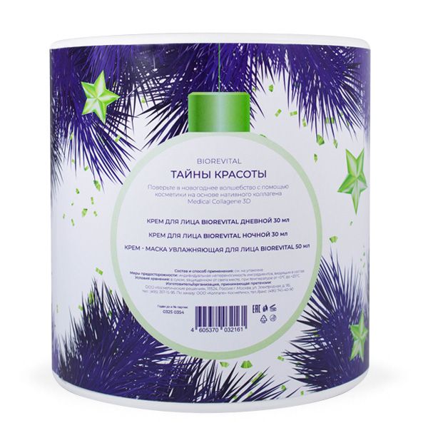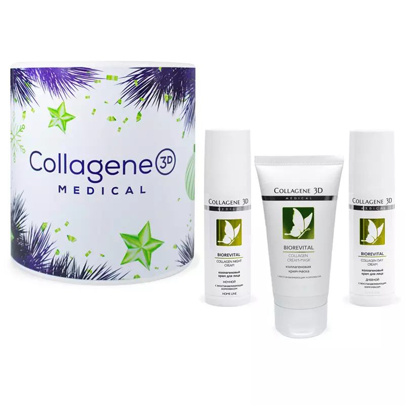Дневной крем: нативный трехспиральный коллаген, гиалуроновая кислота, АНА- кислоты, масла оливы и персиковых косточек, аллантоин, пантенол (провитамин B5), витамин А, витамин Е, витамин С, витамин РР