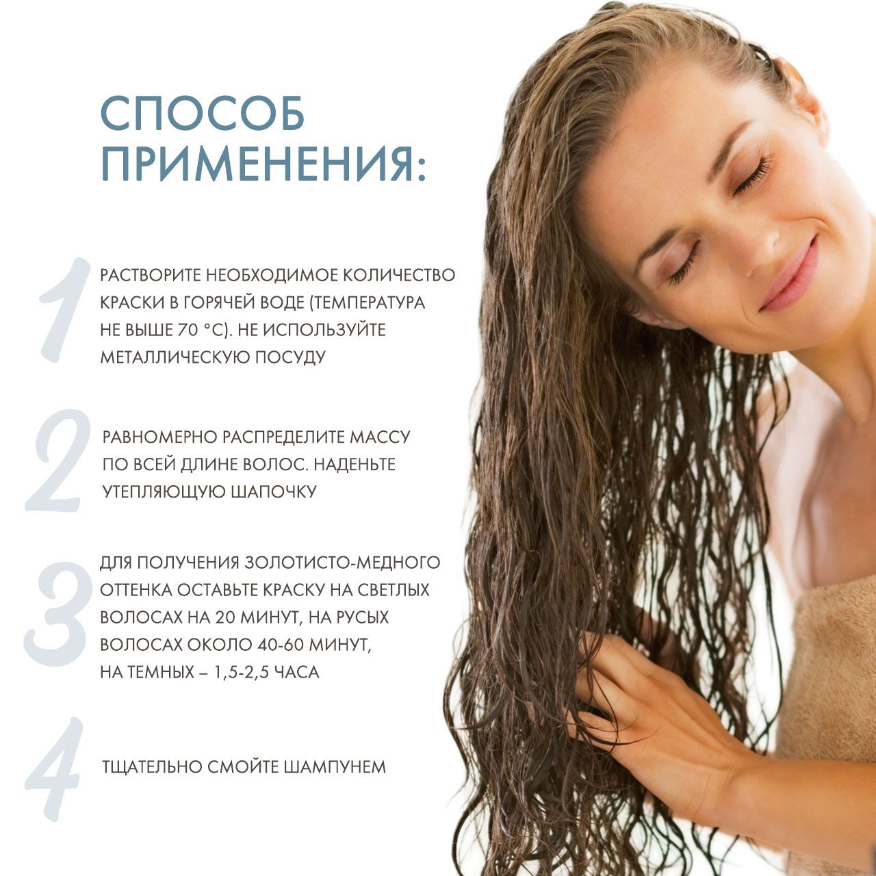 Растворите необходимое количество краски в горячей воде (температура не выше 70 °C). Не используйте металлическую посуду. Равномерно распределите массу по всей длине волос. Наденьте утепляющую шапочку. Для получения золотисто-медного оттенка оставьте краску на светлых волосах на 20 минут, на русых волосах около 40-60 минут, на темных – 1,5-2,5 часа. Тщательно смойте шампунем.