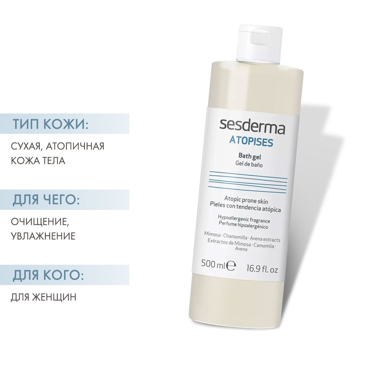 Гель для душа Atopises на основе транексамовой кислоты, цетилпиридиния, экстрактов овса, ромашки и мимозы снимает и предотвращает зуд, успокаивает, увлажняет и восстанавливает гидролипидный барьер кожи, усиливает местный иммунитет, оказывает антисептическое действие, благодаря чему снижается интенсивность и частота обострений. Вспомогательное средство в терапии с применением кортикоидов и иммуномодуляторов. Предотвращает, локализует и уменьшает количество очагов инфекции, предотвращает развитие суперинфекции благодаря бактерицидному действию цетилпиридиния.