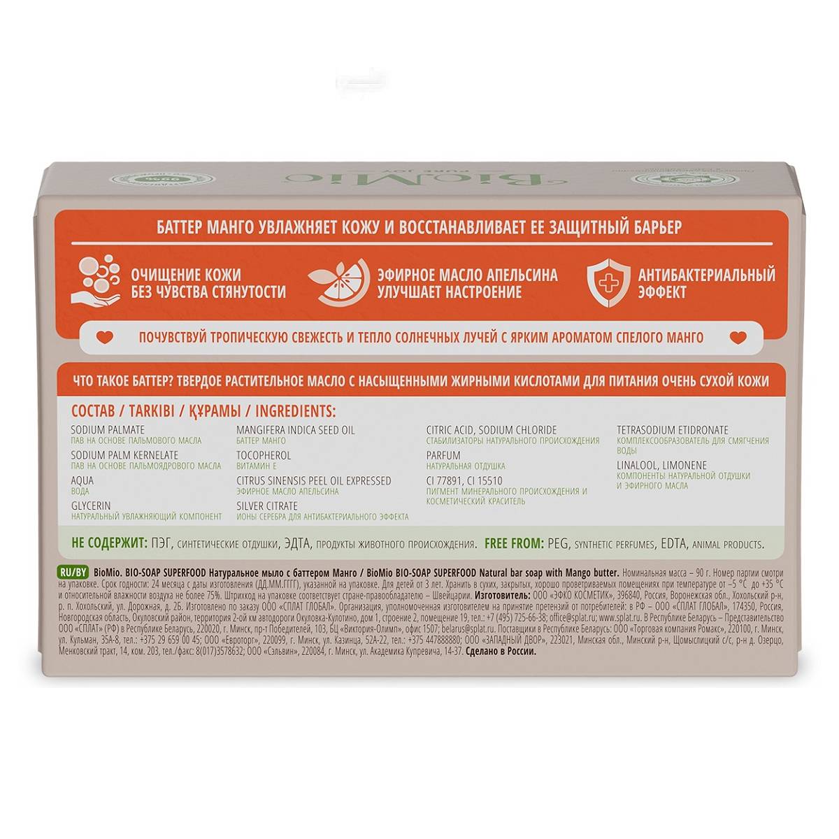 Натуральное веганское мыло BioMio Superfood очищает кожу без чувства стянутости. В составе мыла — баттер манго. Почувствуйте тропическую свежесть и тепло солнечных лучей с ярким ароматом спелого манго!