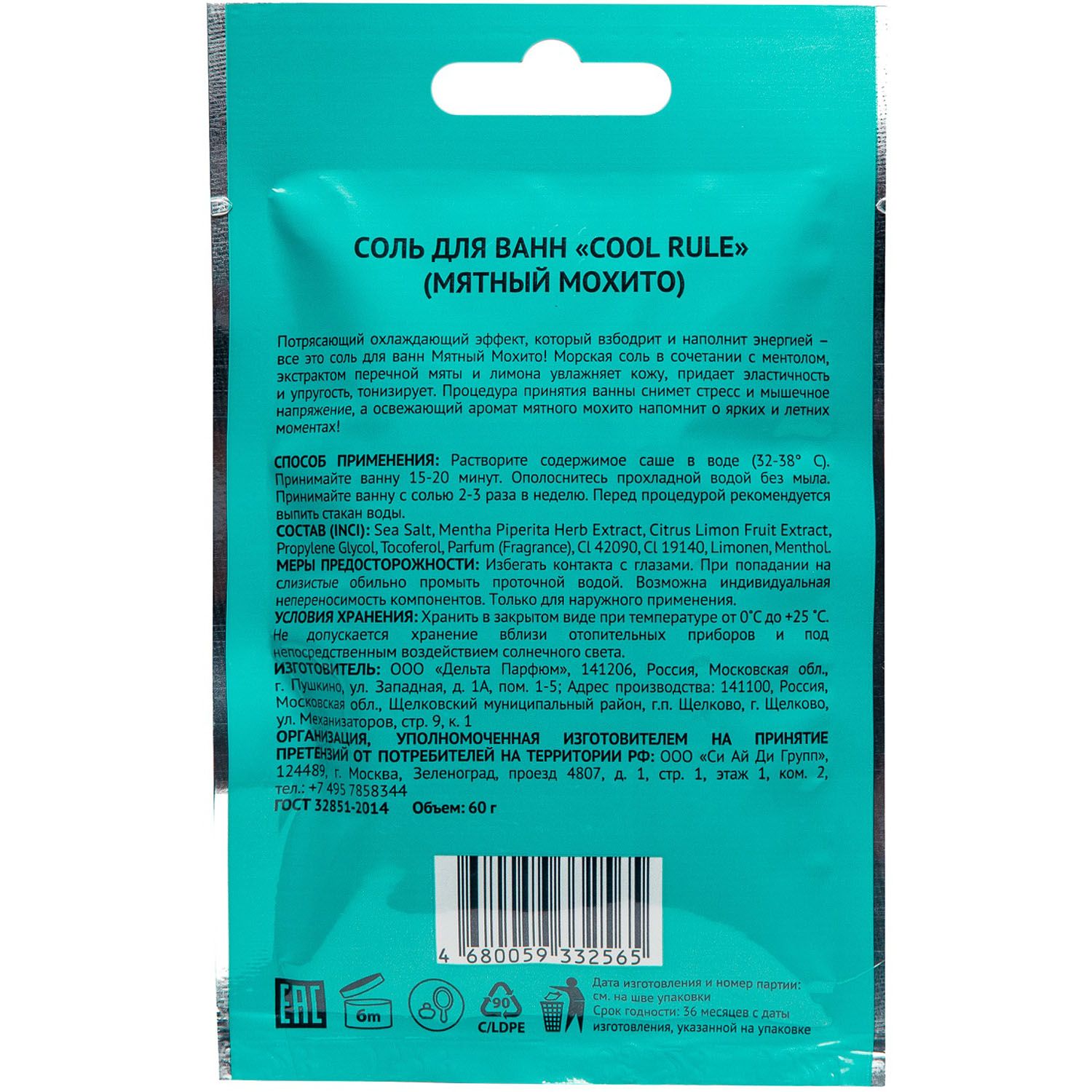 Состав: sea salt, mentha piperita herb extract, citrus limon fruit extract, propylene glycol, tocoferol, parfum (fragrance), Cl 42090, Cl 19140, limonen.