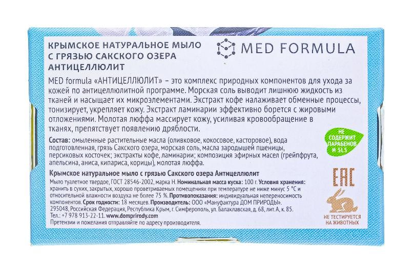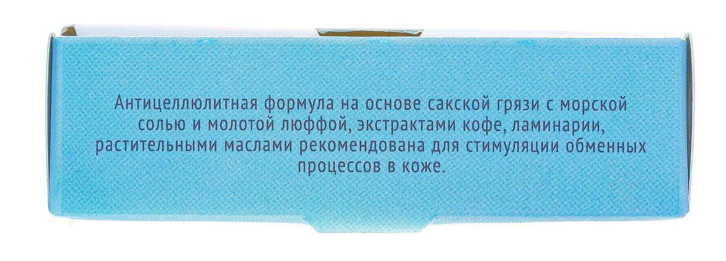 Мыло содержит лечебную грязь Сакского озера, дополненную сбалансированным комплексом природных компонентов, разработанным для ухода за кожей по антицеллюлитной программе. Эфирное масло апельсина витаминизирует кожу, препятствует появлению дряблости. Морская соль помогает вывести лишнюю жидкость из тканей и насыщает клетки полезными микроэлементами. Экстракт кофе активизирует обменные процессы, усиливает циркуляцию крови, тонизирует и укрепляет кожу. Экстракт ламинарии эффективно борется с жировыми отложениями. Масла зародышей пшеницы и персиковых косточек поддерживают эластичность кожи и снабжают ее питательными веществами. Молотая люффа эффективно массирует кожу, усиливая кровообращение в тканях.