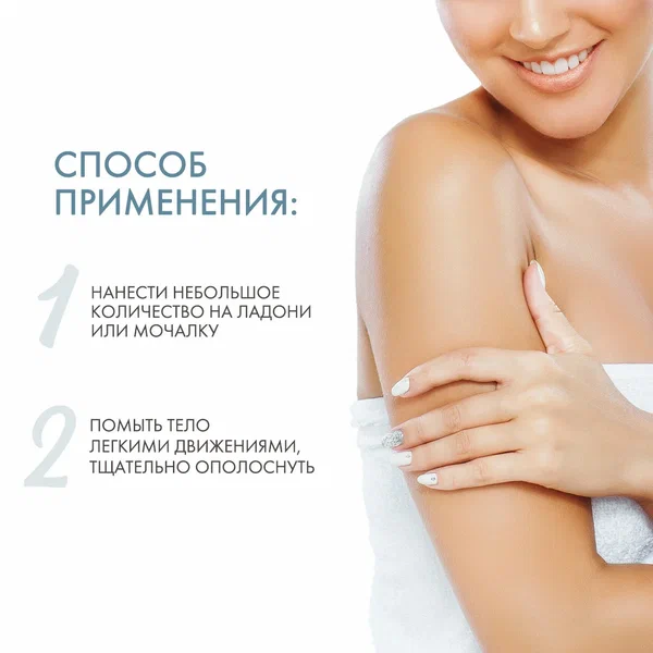 Нанесите небольшое количество геля на ладони или на мочалку. Деликатно, легкими массажными движениями распределите пену по телу, смойте теплой водой