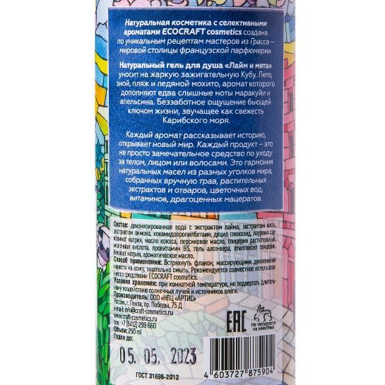 Встряхнуть флакон, массирующими движениями нанести на кожу, тщательно смыть. Рекомендуется совместное использование со скрабом для тела ECOCRAFT.