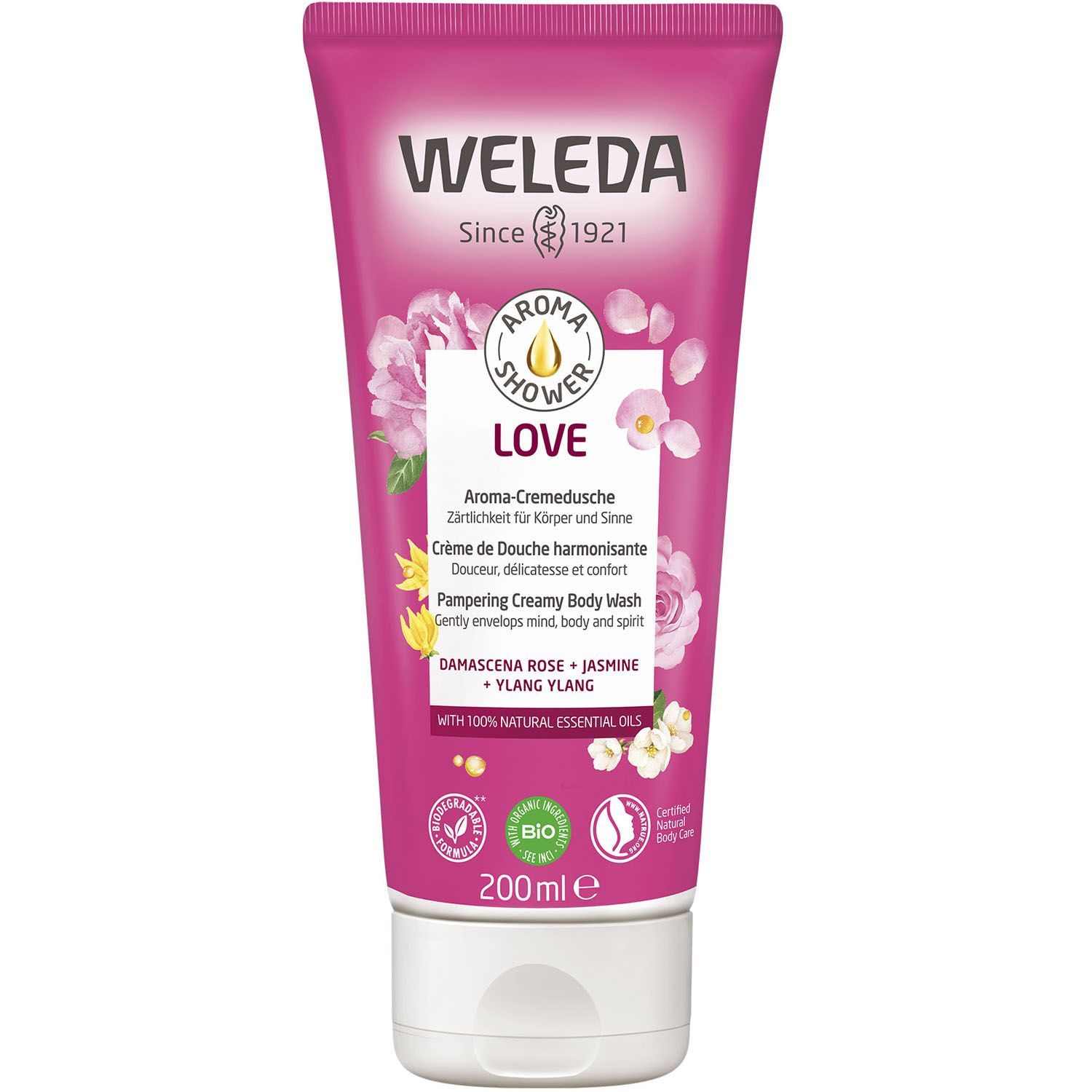 Окружите себя любовью и нежностью с натуральным ароматом романтической розы, жасмина и иланг-иланга. Гель сохраняет естественную влажность кожи, нежно очищая ее с помощью ПАВ растительного происхождения. Имеет мягкую кремовую текстуру (кремообразная формула с питательными свойствами - ~11% растительных масел) и быстро смывается. Протестировано дерматологами