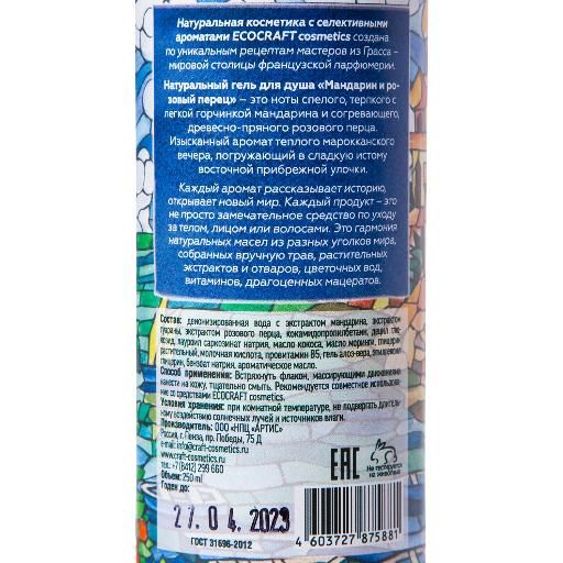 Натуральный гель для душа «Мандарин и розовый перец» - это ноты спелого, терпкого с легкой горчинкой мандарина и согревающего, древесно-пряного розового перца. Изысканный аромат теплого марокканского вечера, погружающий в сладкую истому восточной прибрежной улочки.