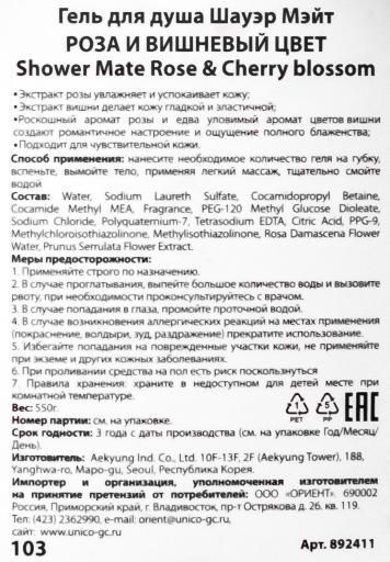 Состав: water, sodium laureth sulfate, cocamidopropyl betaine, cocamide methyl mea, fragrance, peg-120 methyl glucose dioleate, sodium chloride, polyquaternium-7, tetrasodium edta, citric acid, ppg-9, methylchloroisothiazolinone, methylisothiazolinone, rosa damascena flower water, prunus serrulata flower extract