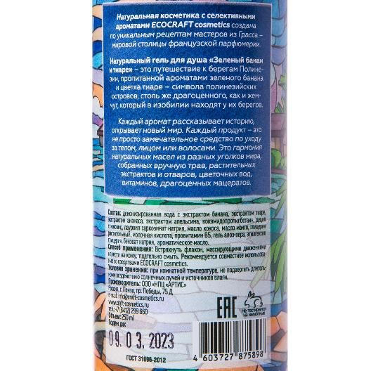 Натуральный гель для душа «Зеленый банан и тиаре» - это путешествие к берегам Полинезии, пропитанной ароматами зеленого банана и цветка тиаре - символа полинезийских островов, столь же драгоценного, как и жемчуг, который в изобилии находят у их берегов.
