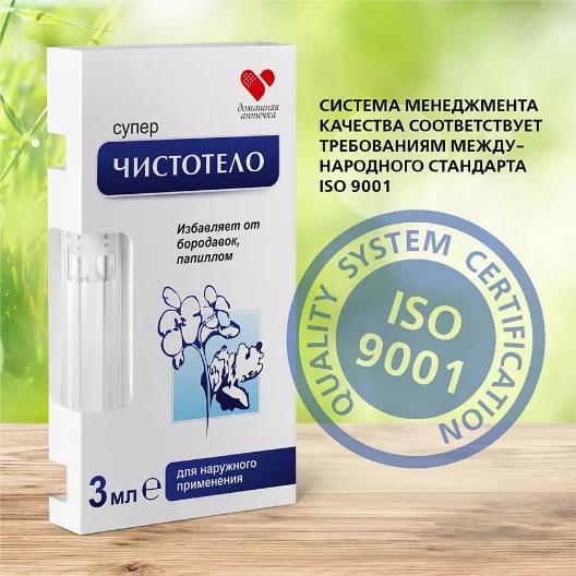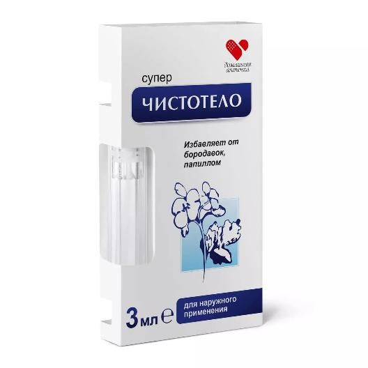 Для быстрого удаления бородавок и папиллом в комфортных домашних условиях создано средство «Суперчистотело», обладающее местным отшелушивающим действием. Эта косметическая жидкость, представляющая собой раствор щелочи, действует особенно эффективно после предварительного распаривания дефектного места. Для исключения травматизации здоровой кожи область вокруг образования перед процедурой смазывается жирным кремом.