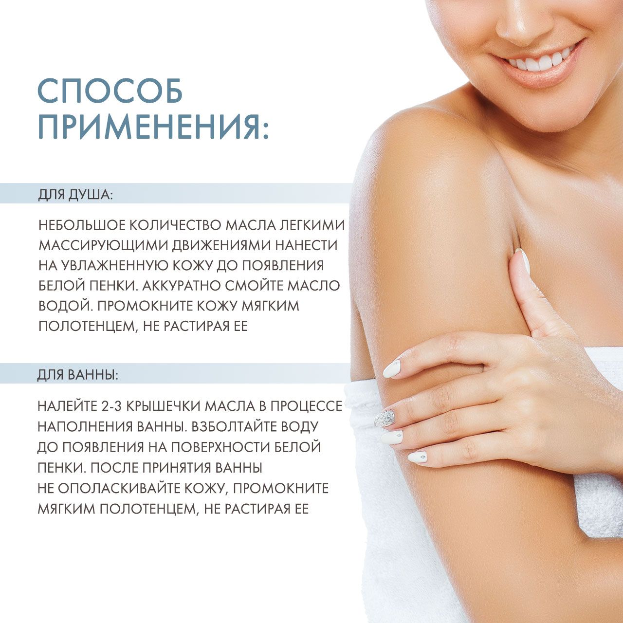 Масло для душа и ванны обеспечивает гигиенический уход за кожей при любых состояниях, сопровождающихся сухостью, шелушением и раздражением, а также используется для профилактики таких состояний.