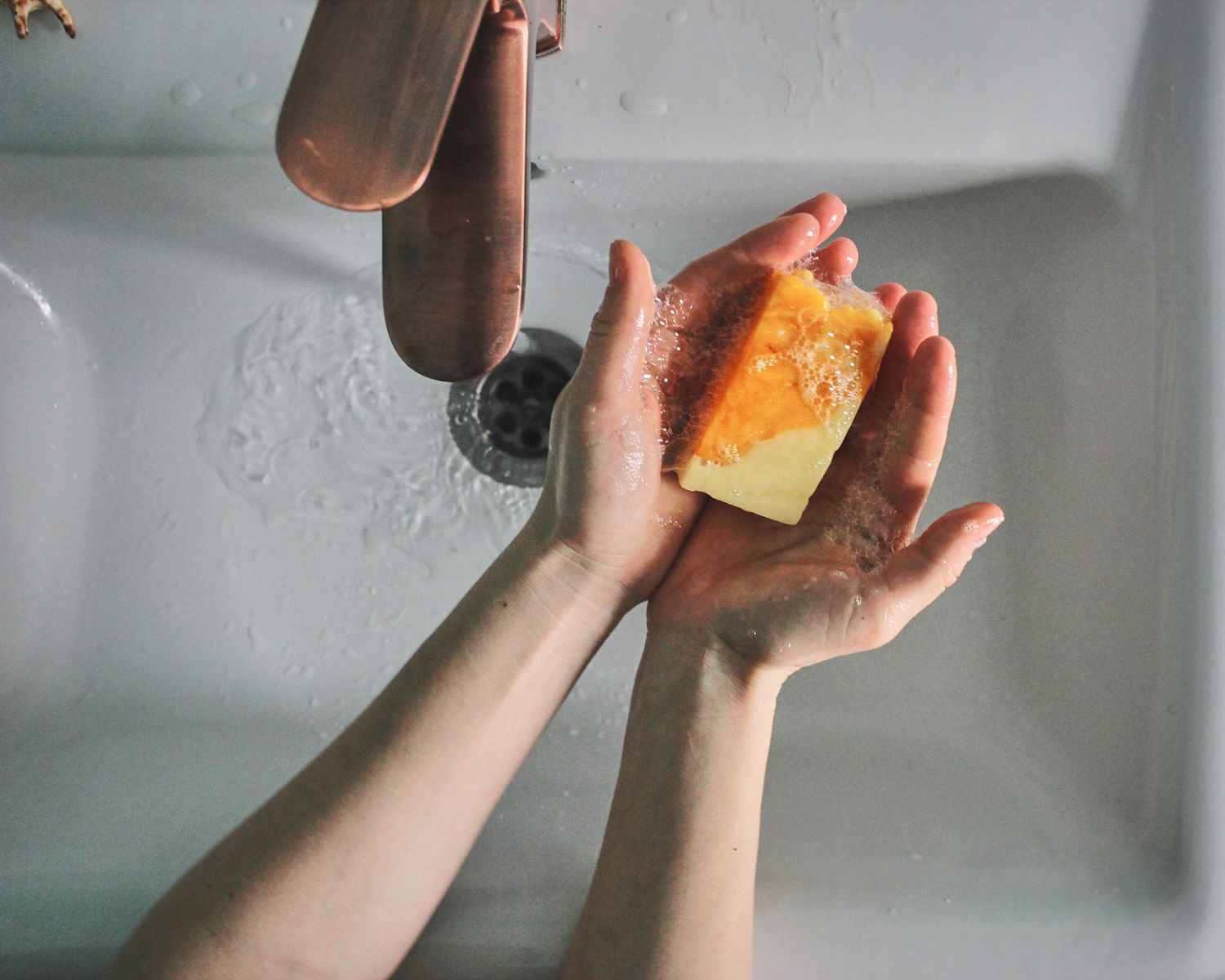 Вспенить мыло в руках или на мочалке. Массирующими движениями промыть кожу. Смыть тёплой водой.