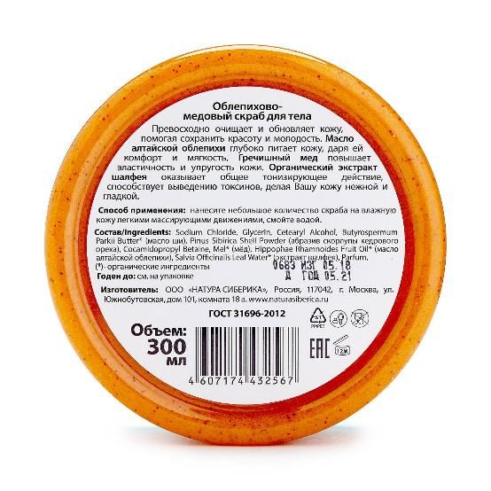 Состав: sodium сhloride, glyсerin, сetearyl alсohol, butyrospermum parkii butter* (масло ши), pinus siberica seed powder (абразив скорлупы кедрового ореха), сoсamidopropyl betaine, mel* (мед), hippophae rhaimnoides fruit oil* (масло алтайской облепихи), salvia offiсinalis leaf water* (экстракт шалфея), parfum