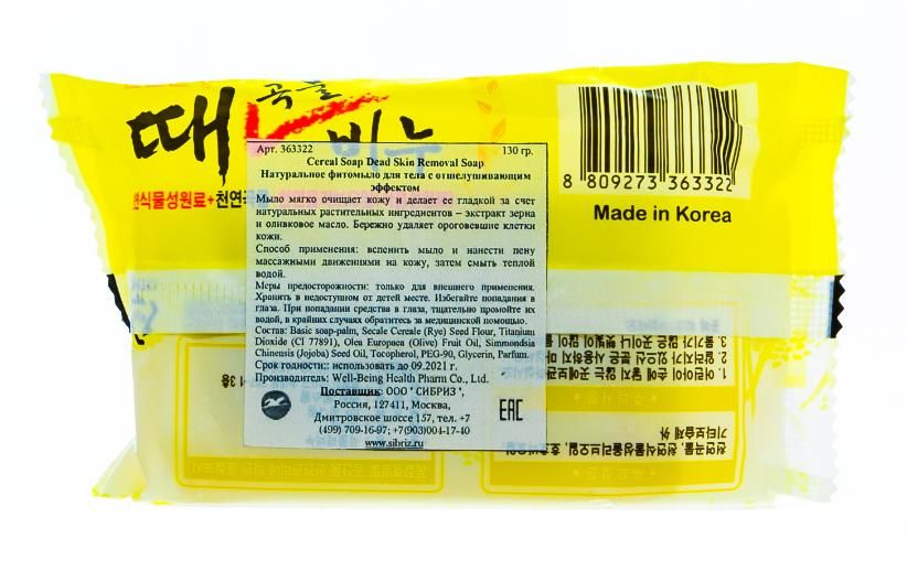 Мыло мягко очищает кожу и делает ее гладкой за счет натуральных растительных ингредиентов – экстракт зерна и оливковое масло. Бережно удаляет ороговевшие клетки кожи.