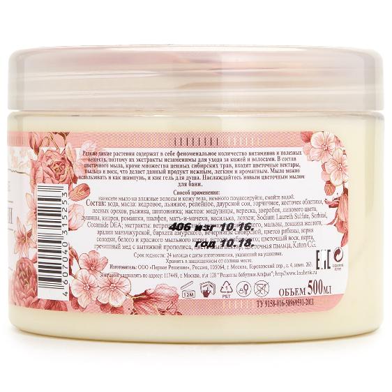 Состав: вода, масла - кедровое, льняное, репейное, даурской сои, горчичное, косточек облепихи, лесных орехов, рыжика, шиповник, настои медуницы, вереска, зверобоя, липового цвета, душицы, кипрея, ромашки, шалфея, мать-и-мачехи, василька, левзеи, sodium laureth sulfate, sorbitol, cocamide dea, экстракты ветреницы лесной, горицвета сибирского, мальвы, донника желтого, аралии маньчжурской, бархата амурского, вечерницы сибирской, цветов рябины, корня солодки, белого и красного мыльного корня, истода сибирского, цветочный воск, перга, гречишный мёд с вытяжкой прополиса, цветочный нектар, цветочная пыльца.