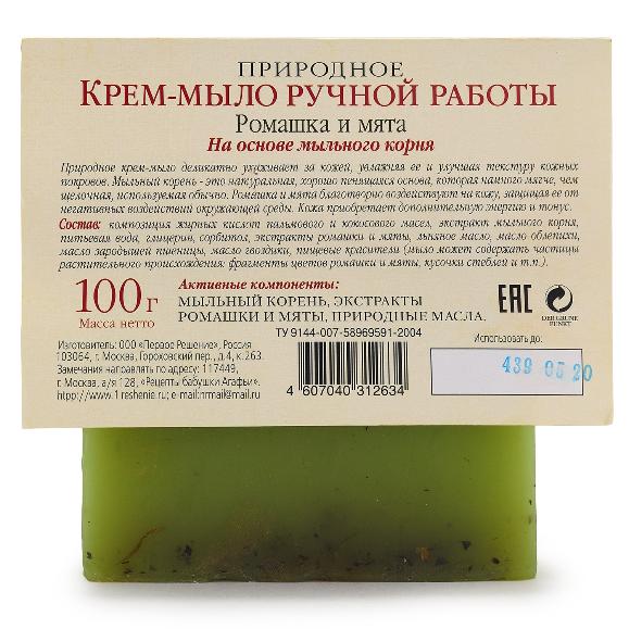 Природное крем-мыло деликатно ухаживает за кожей, увлажняя ее и улучшая текстуру кожных покровов. Мыльный корень - это натуральная, хорошо пенящаяся основа, которая намного мягче, чем щелочная, используемая в обычном мыле. Ромашка и мята благотворно воздействуют на кожу, защищая ее от негативных воздействий окружающей среды. кожа приобретает дополнительную энергию и тонус.