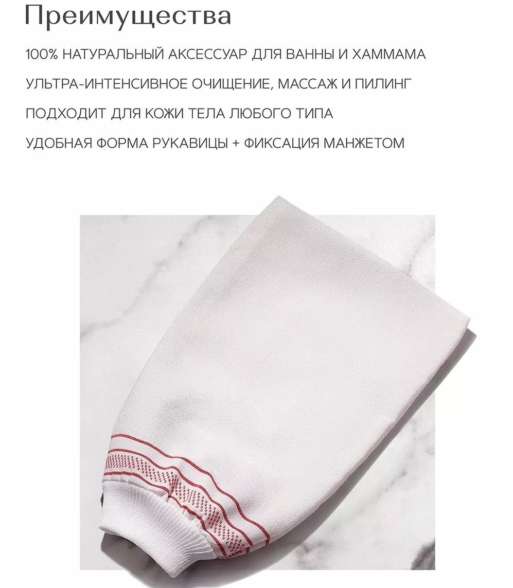 Массаж с кесе также улучшает кровообращение, укрепляет стенки сосудов и капилляров, что существенно продлевает молодость кожи. Уникальная форма с манжетом фиксирует рукавицу во время пилинга и облегчает процесс очищения.