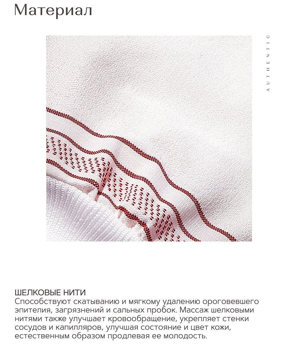 Добавление шелковых нитей в волокна способствует скатыванию и мягкому удалению ороговевшего эпителия, загрязнений и сальных пробок, что позволяет коже свободно дышать и максимально эффективно воспринимать уходовые средства.