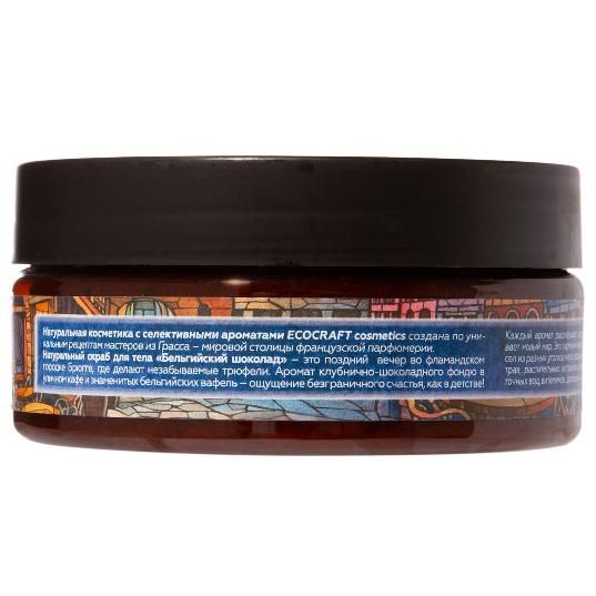 Роскошный скраб для тела отшелушивает омертвевшие клетки, открывая свежую и сияющую кожу. Молотая скорлупа кедрового ореха и виноградной косточки шлифуют, полируют кожу, счищают с неё отмершие клетки, грязь и пыль. Витамин Е, экстракты зеленого кофе и горького миндаля омолаживают кожу, разглаживают неровности, насыщают питательными веществами и микроэлементами. Натуральный скраб для тела «Бельгийский шоколад» - это поздний вечер во фламандском городке Брюгге, где делают незабываемые трюфели. Аромат клубнично-шоколадного фондю в уличном кафе и знаменитых бельгийских вафель – ощущение безграничного счастья, как в детстве!