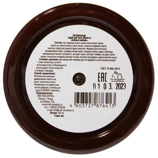 Соль морская, масло какао, масло какао тертое, масло ши, масло кокоса, масло манго, скорлупа кедрового ореха молотая, скорлупа грецкого ореха молотая, глицерин растительный, цетеариловый спирт, глицерил моностеарат, глицерил кокоат, децил глюкозид, минеральный пигмент, витамин Е, экстракт манго, экстракт имбиря, экстракт бугенвилии, этилгексил глицерин, бензоат натрия, экстракт розмарина, ароматическое масло.