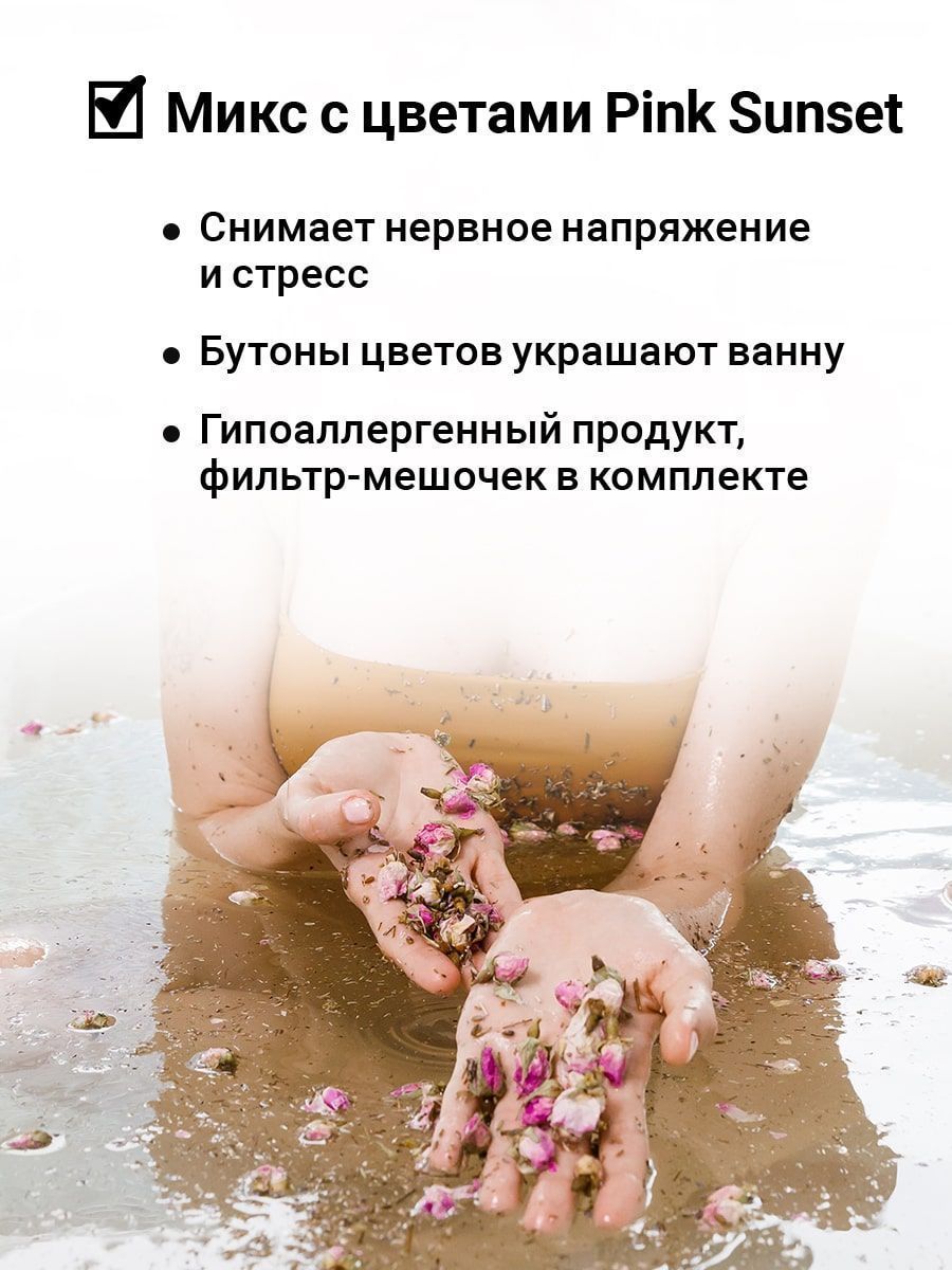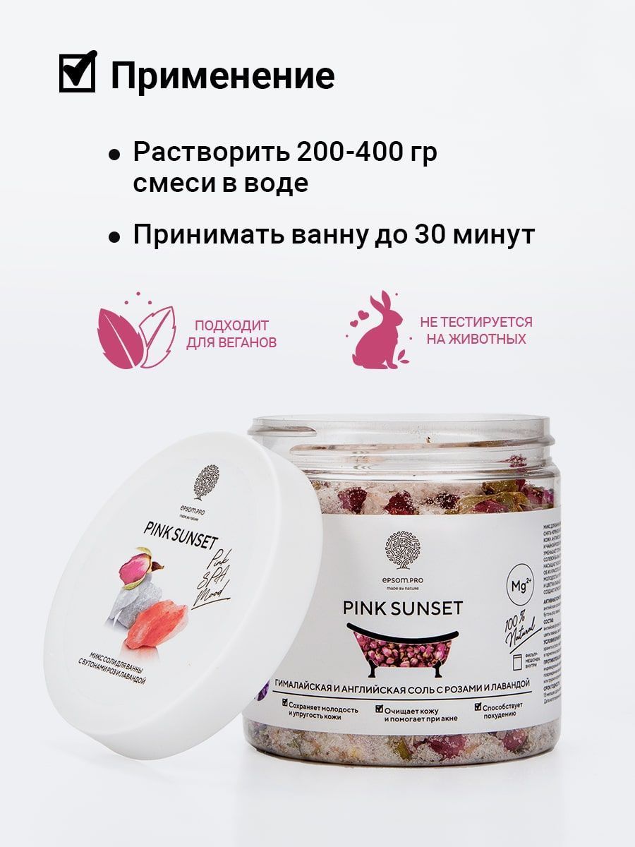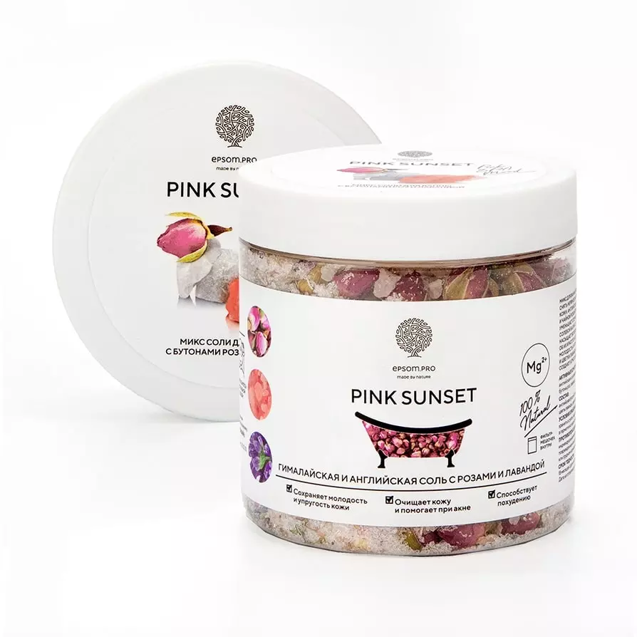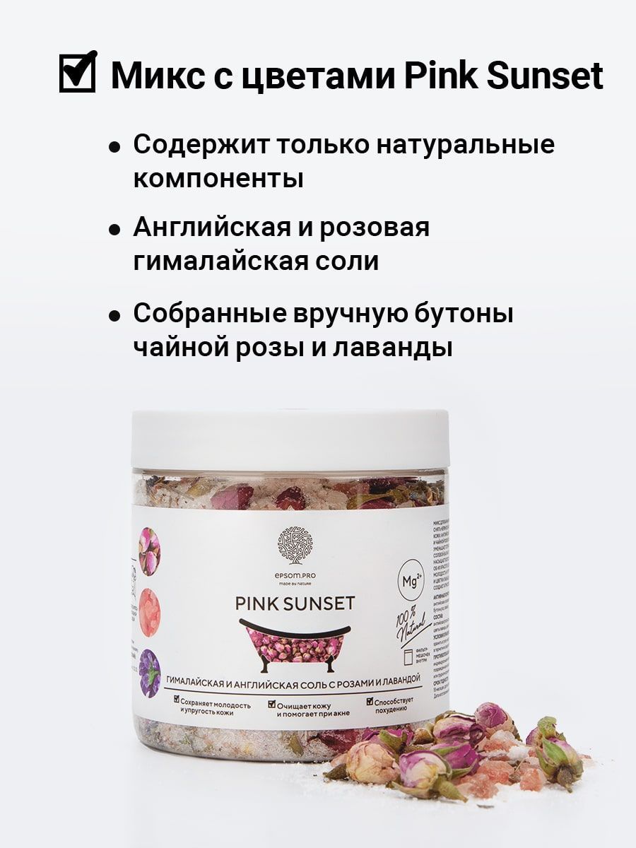 Микс для ванной Pink Sunset помогает расслабить тело, снять нервное напряжение и сделать кожу красивой и здоровой. Английская соль в сочетании с ароматом лаванды и чайной розы успокаивает нервы и расслабляет, восстанавливает водно-солевой баланс и снимает отёчность. Розовая гималайская соль насыщает кожу минералами, заботится о здоровье и красоте волос и кожи, сохраняя ее молодой и упругой. Бутоны розы и цветки лаванды, раскрываясь в воде, создают атмосферу изысканного расслабления.