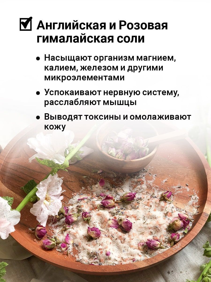 Состав: английская соль, розовая гималайская соль, цветы лаванды, бутоны чайной розы.