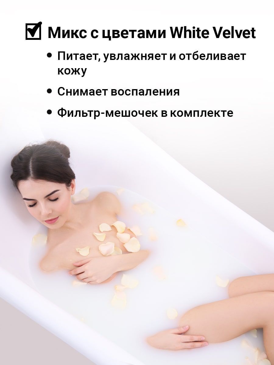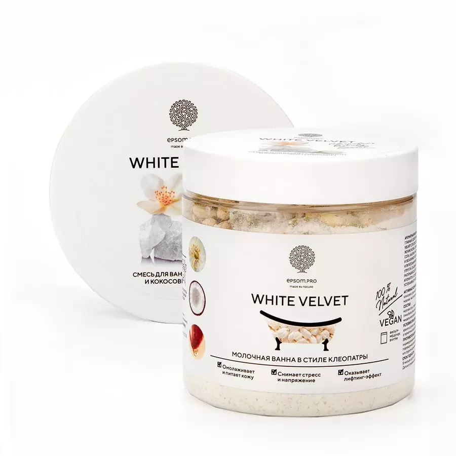 Ароматная молочная смесь для ванны White Velvet - главный секрет красоты Клеопатры. Ванна с White Velvet способствует мягкому очищению и омоложению кожи, снимает стресс и напряжение. Морская соль, каолин, масло миндаля и жасмина питают и увлажняют кожу, обогащают минеральными и питательными веществами, разглаживают и делают упругой, оказывают общий лифтинг-эффект. Жасмин, раскрываясь в теплой воде, окутывает тело нежным ароматом, а сливки и кокосовое молоко успокаивают и восстанавливают кожу.
