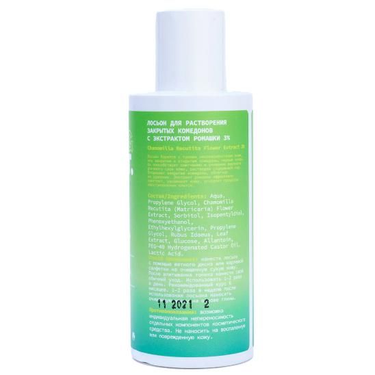 Лосьон борется с такими несовершенствами кожи, как закрытые и открытые комедоны, черные точки. Он способствует смягчению и очищению верхнего рогового слоя кожи, растворяя содержимое пор. Открывает закрытые комедоны, облегчая их удаление. Экстракт ромашки эффективно смягчает, увлажняет кожу, ускоряет процессы восстановления клеток. Экстракт ромашки: