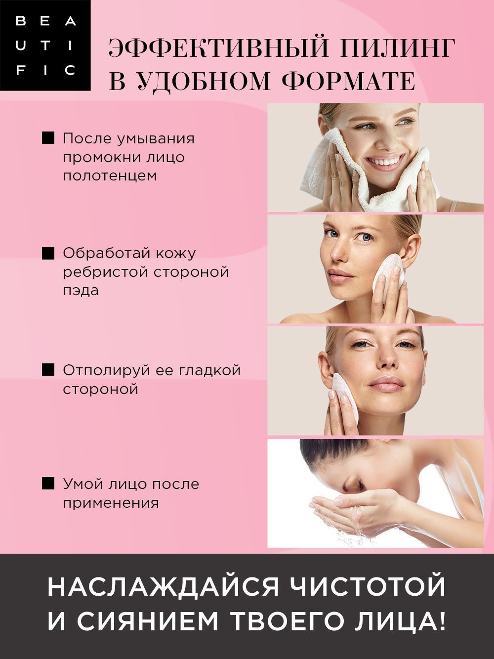 Чистое сухое лицо обработай пилинг-пэдами по массажным линиям: сначала более выпуклой стороной, затем более гладкой. После применения умой лицо.