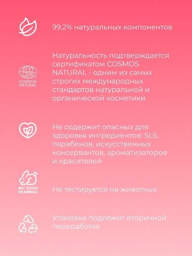 Создано из природных компонентов высокого качества. Не содержит SLS, парабенов, искусственных консервантов, ароматизаторов и красителей. Натуральность – 99,2%