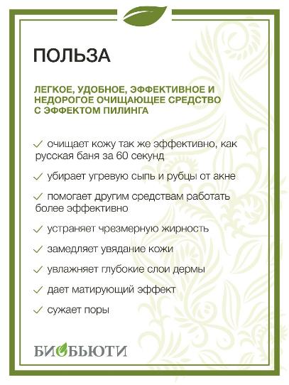 Прекрасно очищает, успокаивает раздражения и воспаления. При регулярном использовании, убирает излишнюю жирность и черные точки, выравнивает тон. Смягчает сухую кожу, убирает шелушения.