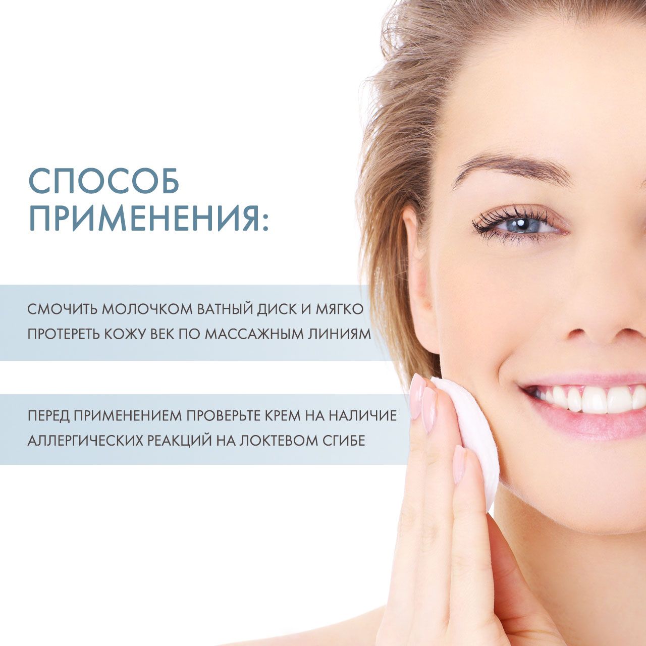 Для снятия макияжа с лица: на увлажненный ватный диск выдавить одну порцию крема из тубы размером с горошину, диском с молочком протереть лицо по массажным линиям, удаляя макияж.